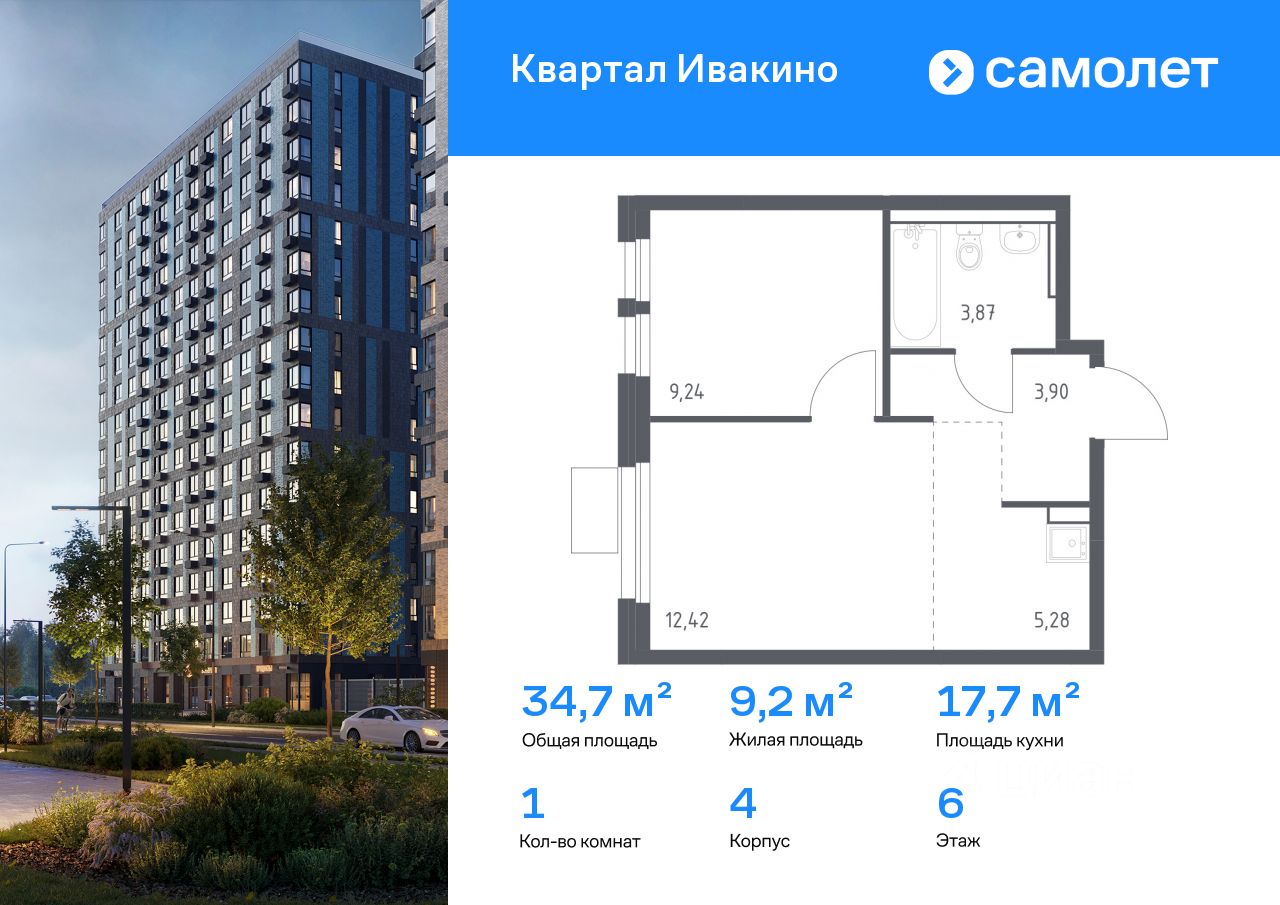 Строим кварталы для жизни с заботой о будущем. Предлагается 1-комнатная квартира комфорт-класса 34,71 кв.м в корпусе 4 на 6 этаже, в ЖК "Квартал Ивакино"