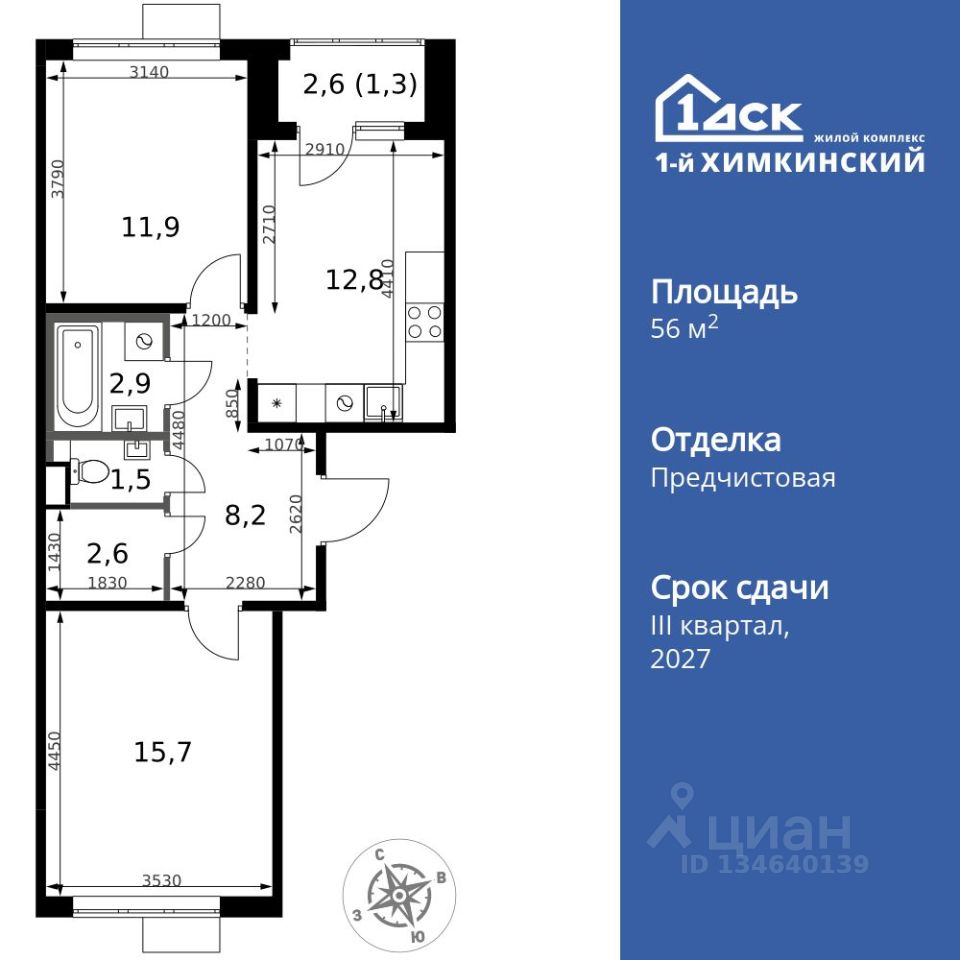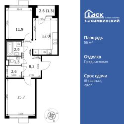 Продаётся 2-к квартира номер 240 общей площадью 56.9 кв.м. на 5-м этаже 9 этажного здания. Отделка Whitebox. Цена с учётом скидки.