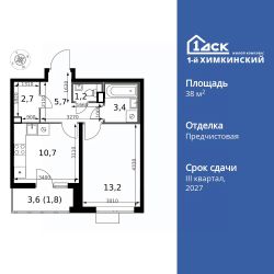 Продаётся 1-к квартира номер 528 общей площадью 38.7 кв.м. на 5-м этаже 13 этажного здания. Отделка Whitebox. Цена с учётом скидки.