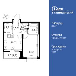 Продаётся 1-к квартира номер 520 общей площадью 38.7 кв.м. на 3-м этаже 13 этажного здания. Отделка Whitebox. Цена с учётом скидки.