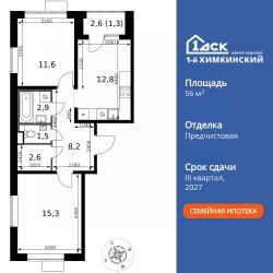 Продаётся 2-к квартира номер 618 общей площадью 56.2 кв.м. на 15-м этаже 16 этажного здания. Отделка Whitebox. Цена с учётом скидки.