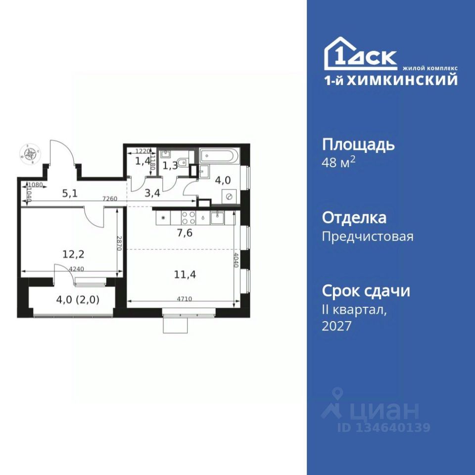 Продаётся 2-к квартира номер 46 общей площадью 48.4 кв.м. на 5-м этаже 17 этажного здания. Отделка Whitebox.