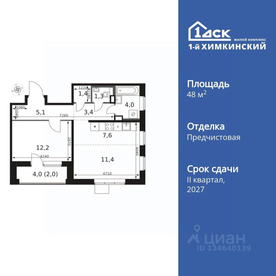 Продаётся 2-к квартира номер 88 общей площадью 48.4 кв.м. на 8-м этаже 17 этажного здания. Отделка Whitebox.