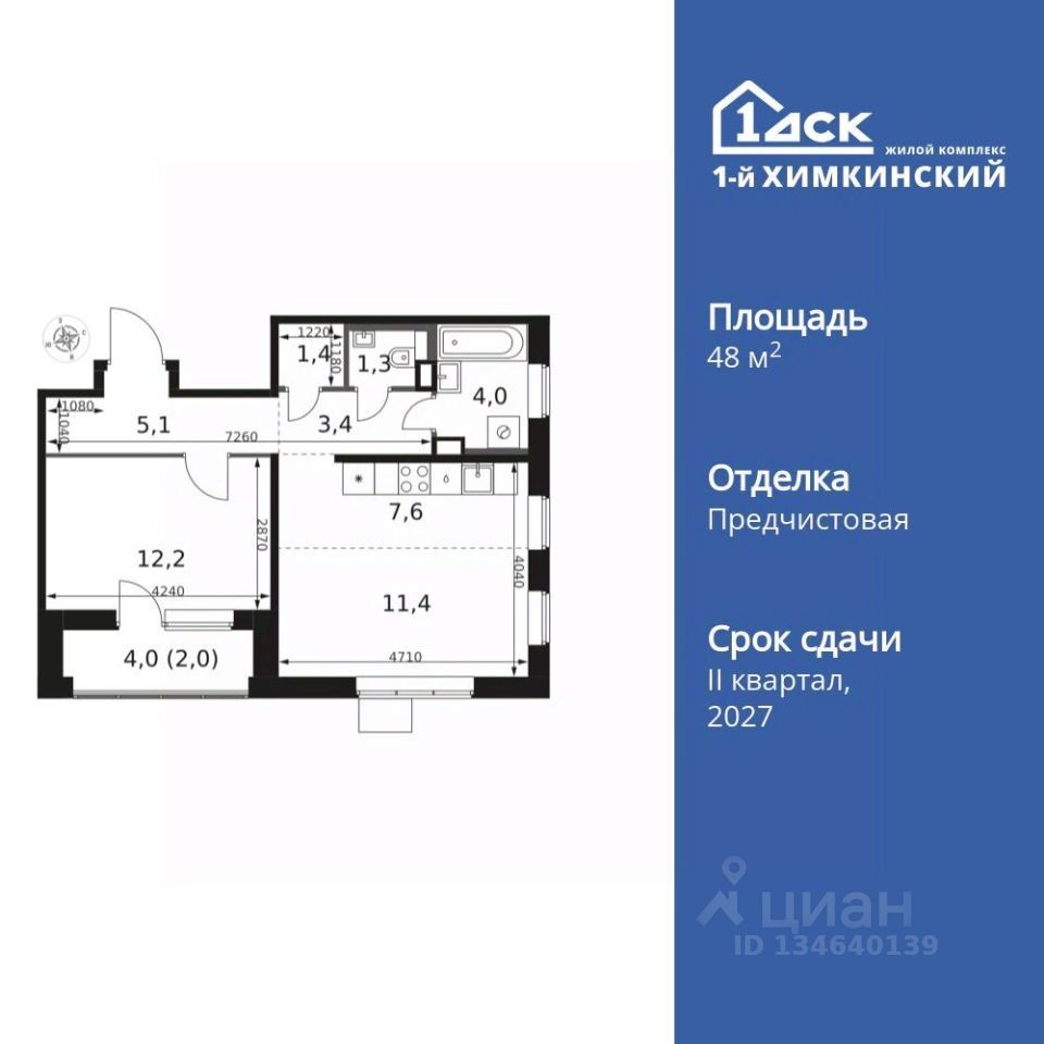 Продаётся 2-к квартира номер 130 общей площадью 48.4 кв.м. на 11-м этаже 17 этажного здания. Отделка Whitebox.