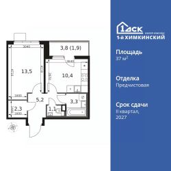 Продаётся 1-к квартира номер 142 общей площадью 37.7 кв.м. на 12-м этаже 17 этажного здания. Отделка Whitebox.
