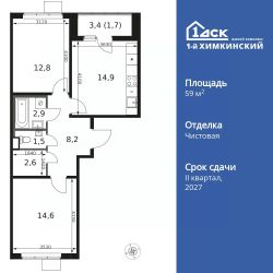 Продаётся 2-к квартира номер 252 общей площадью 59.2 кв.м. на 5-м этаже 14 этажного здания. Чистовая отделка.