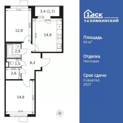 Продаётся 2-к квартира номер 294 общей площадью 59.2 кв.м. на 11-м этаже 14 этажного здания. Чистовая отделка.