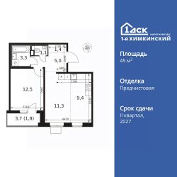 Продаётся 2-к квартира номер 478 общей площадью 45.8 кв.м. на 8-м этаже 14 этажного здания. Отделка Whitebox.