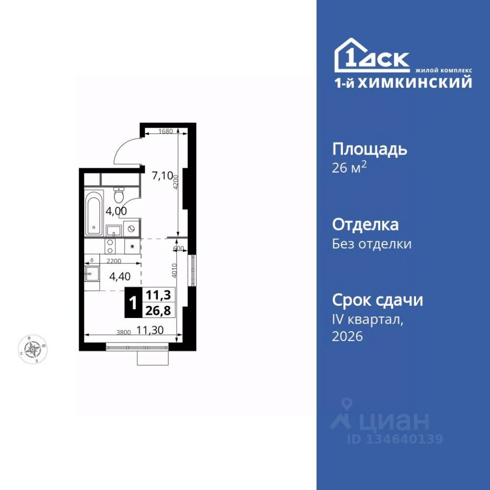 Продаётся квартира-студия номер 279 общей площадью 26.8 кв.м. на 14-м этаже 16 этажного здания. Без отделки.