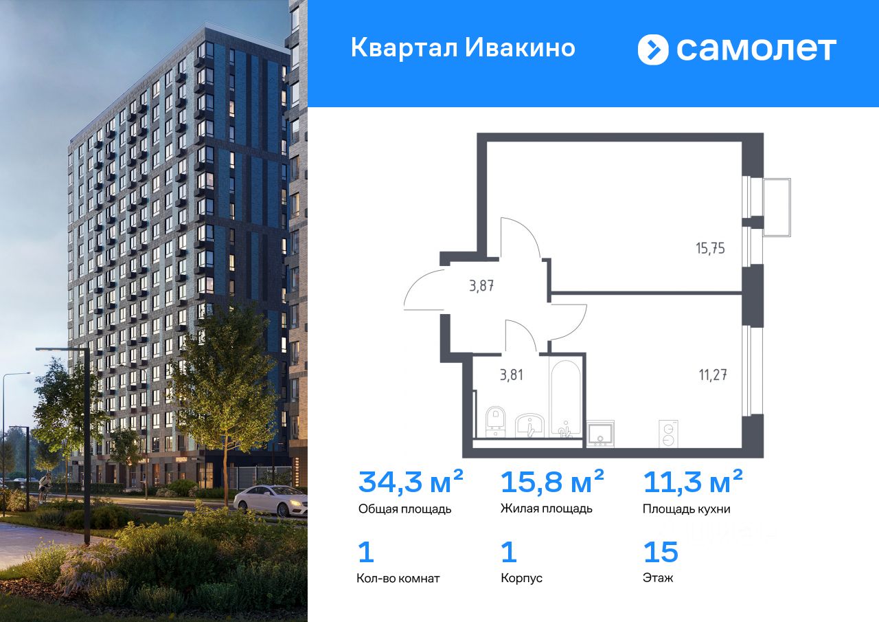 Строим кварталы для жизни с заботой о будущем. Предлагается 1-комнатная квартира комфорт-класса 34,3 кв.м в корпусе 1 на 15 этаже, в ЖК "Квартал Ивакино"
