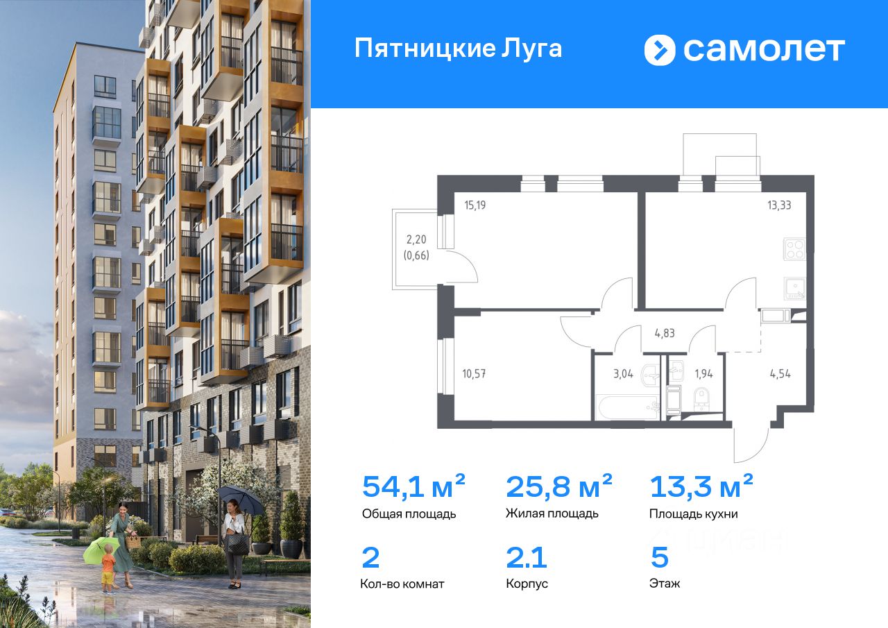 Строим кварталы для жизни с заботой о будущем. Предлагается 2-комнатная квартира комфорт-класса 54,1 кв.м в корпусе 2.1 на 5 этаже, в ЖК "Пятницкие Луга"