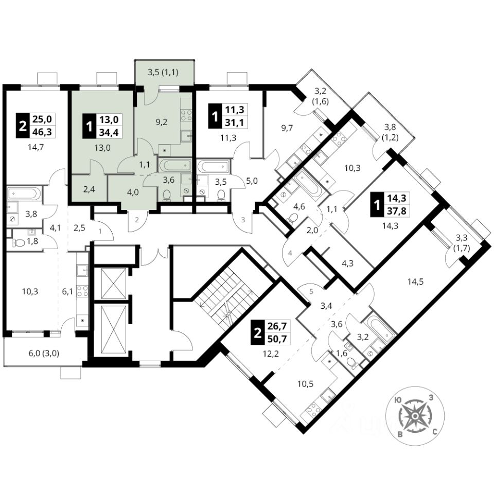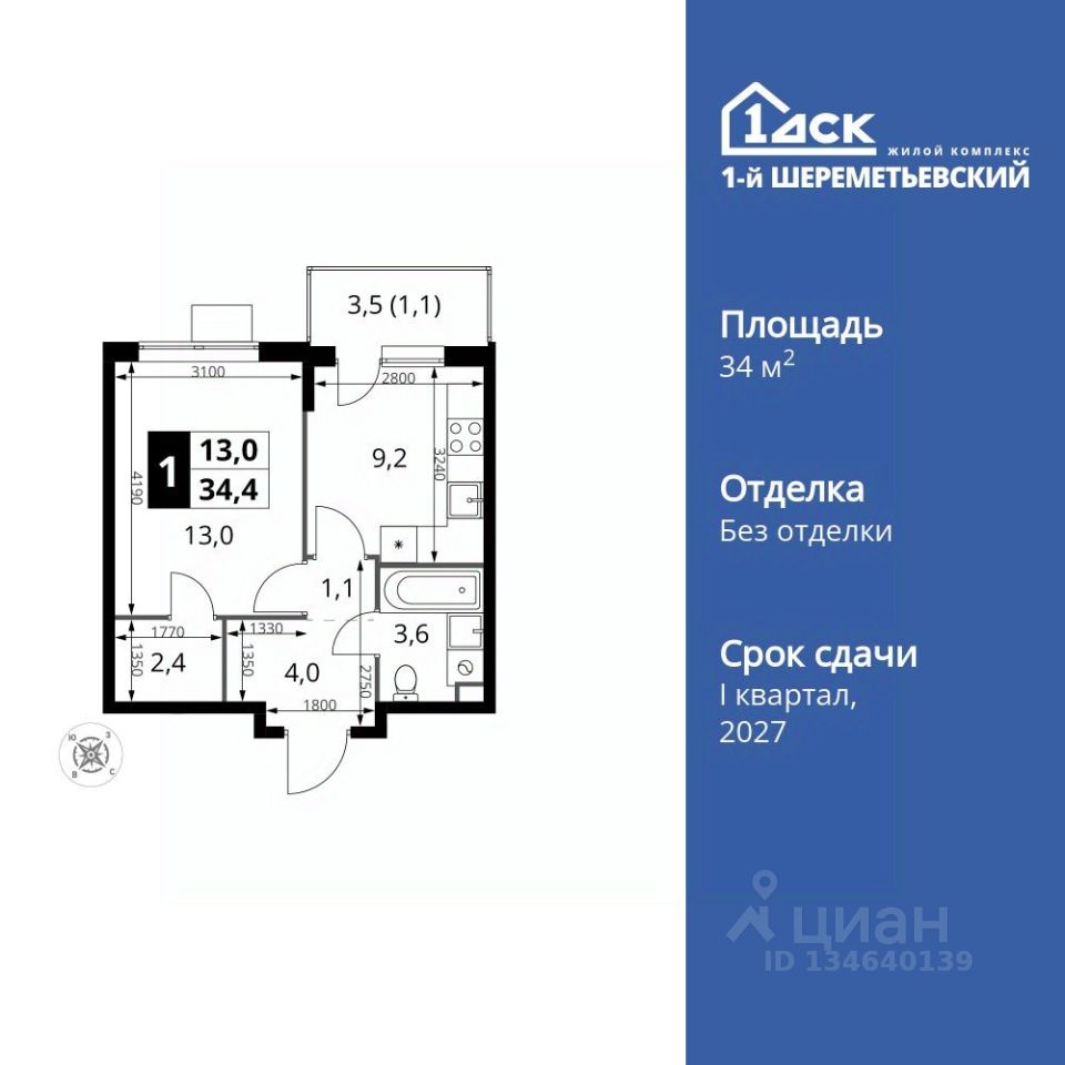Продаётся 1-к квартира номер 102 общей площадью 34.4 кв.м. на 4-м этаже 16 этажного здания. Без отделки.