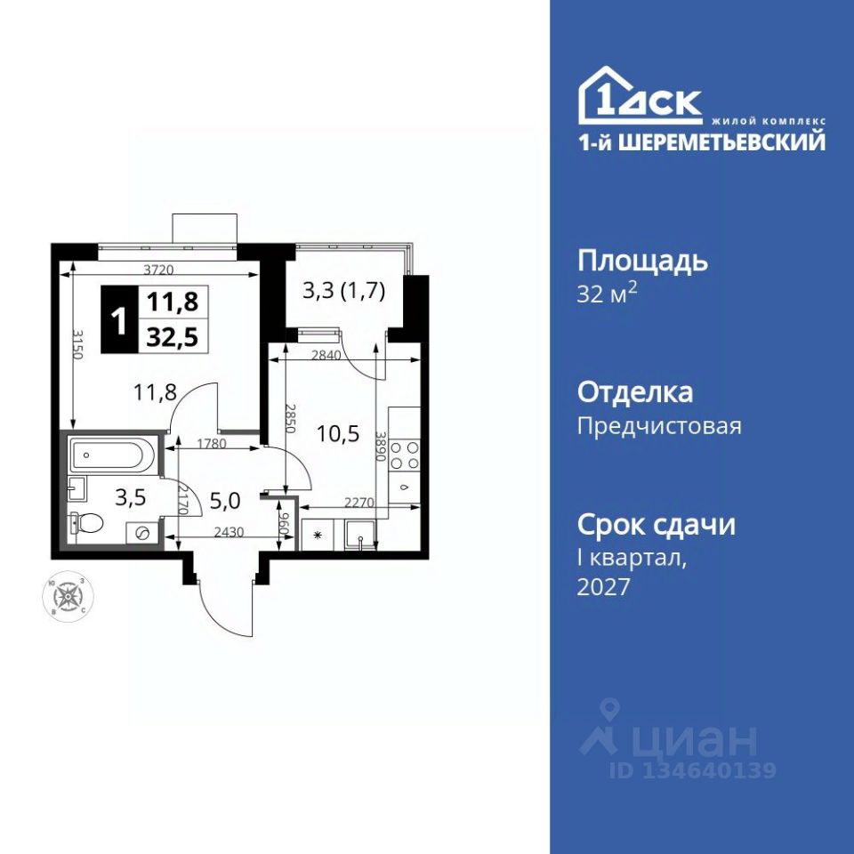 Продаётся 1-к квартира номер 303 общей площадью 32.5 кв.м. на 12-м этаже 16 этажного здания. Отделка Whitebox. Цена с учётом скидки.