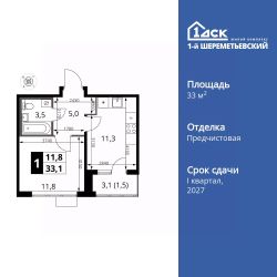 Продаётся 1-к квартира номер 223 общей площадью 33.1 кв.м. на 5-м этаже 16 этажного здания. Отделка Whitebox. Цена с учётом скидки.