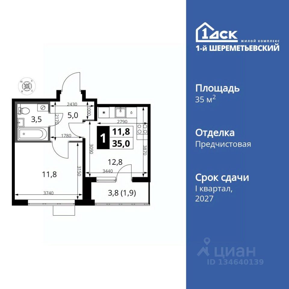 Продаётся 1-к квартира номер 233 общей площадью 35 кв.м. на 6-м этаже 16 этажного здания. Отделка Whitebox. Цена с учётом скидки.