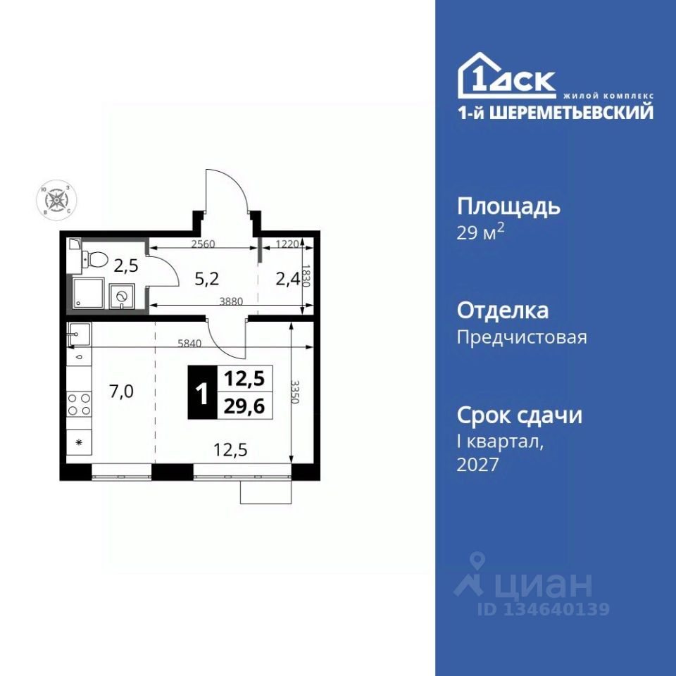 Продаётся квартира-студия номер 237 общей площадью 29.6 кв.м. на 6-м этаже 16 этажного здания. Отделка Whitebox.