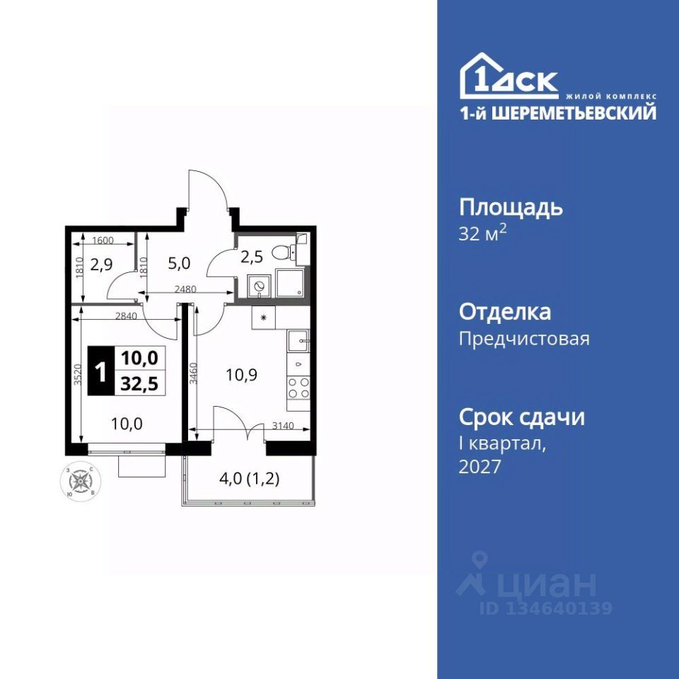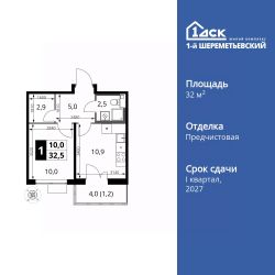 Продаётся 1-к квартира номер 544 общей площадью 32.5 кв.м. на 6-м этаже 16 этажного здания. Отделка Whitebox. Цена с учётом скидки.
