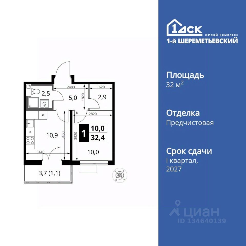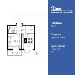 Продаётся 1-к квартира номер 547 общей площадью 32.4 кв.м. на 7-м этаже 16 этажного здания. Отделка Whitebox. Цена с учётом скидки.