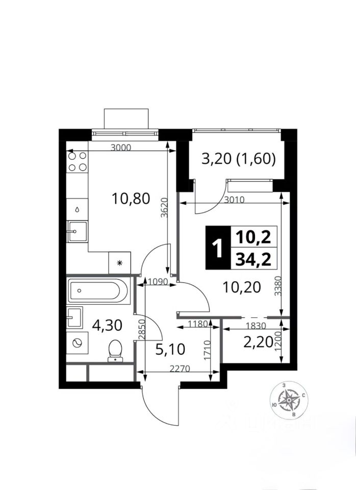 Отличная 1 комнатная квартира с просторной кухней (11 м2), лоджией и гардеробной!
