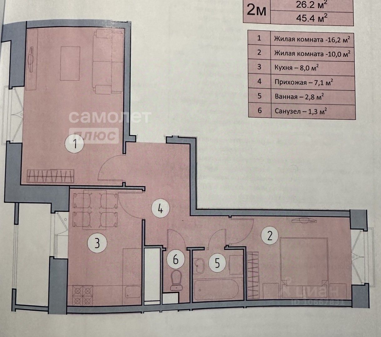 Общая площадь квартиры составляет 45,5 - без учета лоджии . Это не просто двухкомнатная квартира, а лучший вариант в ЖК, продуманный до мелочей. Идеальное расположение по сторонам света гарантирует комфортное естественное освещение в любое время суток.