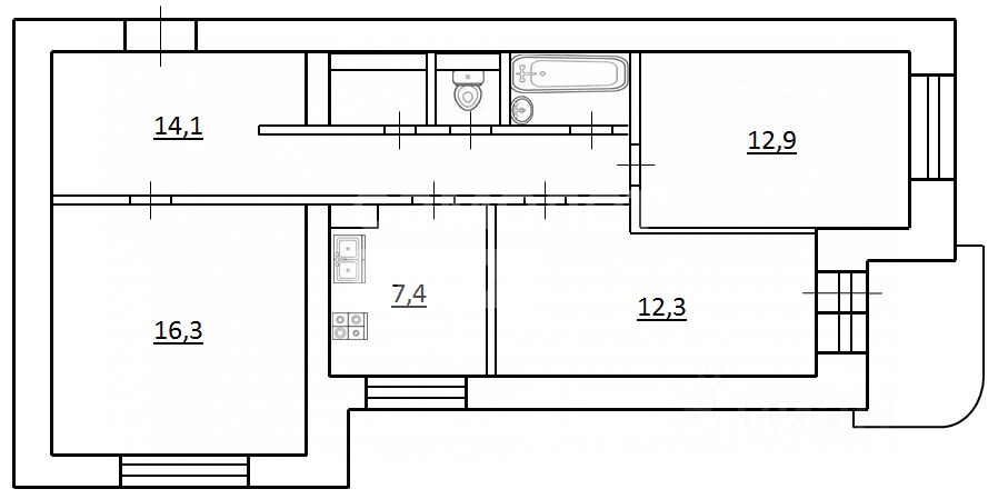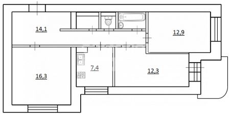 Квартира имеет отличную планировку общей площадью 68.1 кв. м с тремя изолированными комнатами: 16.3; 12.3; 12.9, кухня 7.4 кв. м и просторным коридором. Выход на остекленный балкон из спальни. Санузел раздельный. В квартире высокие потолки 2,7 м, что обеспечивает в квартире комфортную атмосферу.