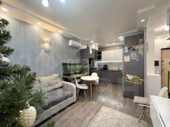 Планировка включает изолированную спальню, просторную прихожую со встроенной системой хранения и большую кухню-гостиную площадью 17,5 кв. м. Кухня оснащена гарнитуром и встроенной техникой премиум класса марки Neff, которая остается новым владельцам.