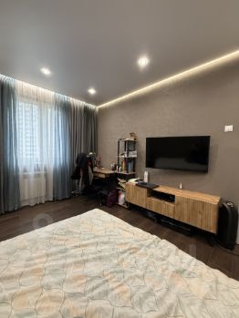 Натяжные потолки, в комнатах в дополнение к основному свету сделаны парящие потолки.