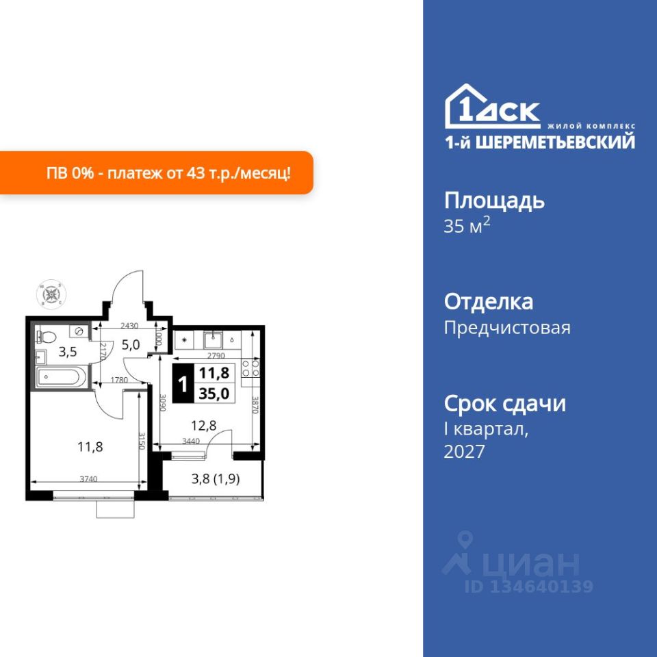 Продаётся 1-к квартира номер 353 общей площадью 35 кв.м. на 16-м этаже 16 этажного здания. Отделка Whitebox. Цена с учётом скидки.