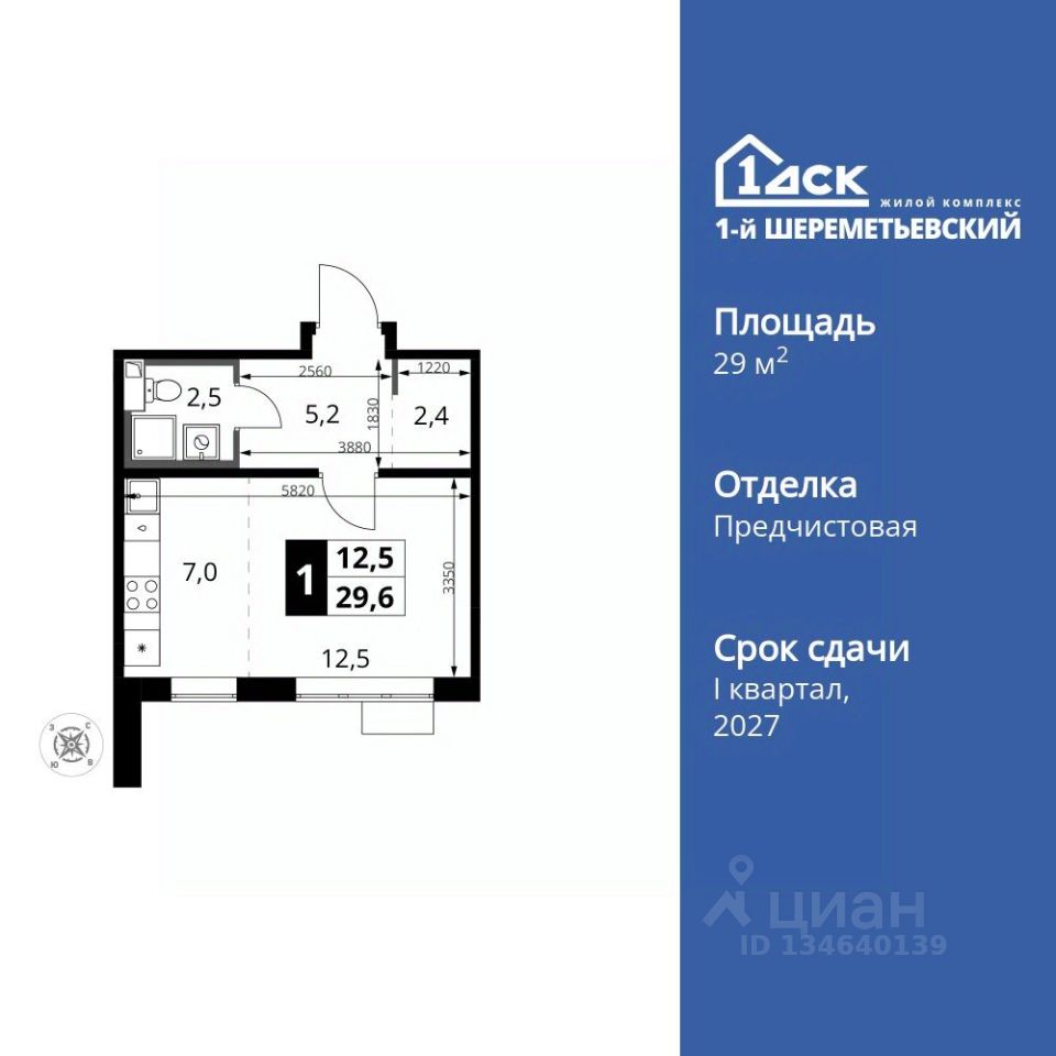 Продаётся квартира-студия номер 465 общей площадью 29.6 кв.м. на 16-м этаже 16 этажного здания. Отделка Whitebox.
