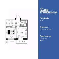 Продаётся 1-к квартира номер 576 общей площадью 32.4 кв.м. на 14-м этаже 16 этажного здания. Отделка Whitebox. Цена с учётом скидки.