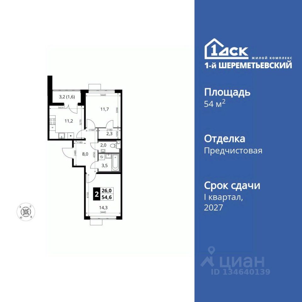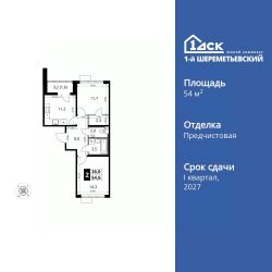 Продаётся 2-к квартира номер 602 общей площадью 54.6 кв.м. на 6-м этаже 16 этажного здания. Отделка Whitebox. Цена с учётом скидки.