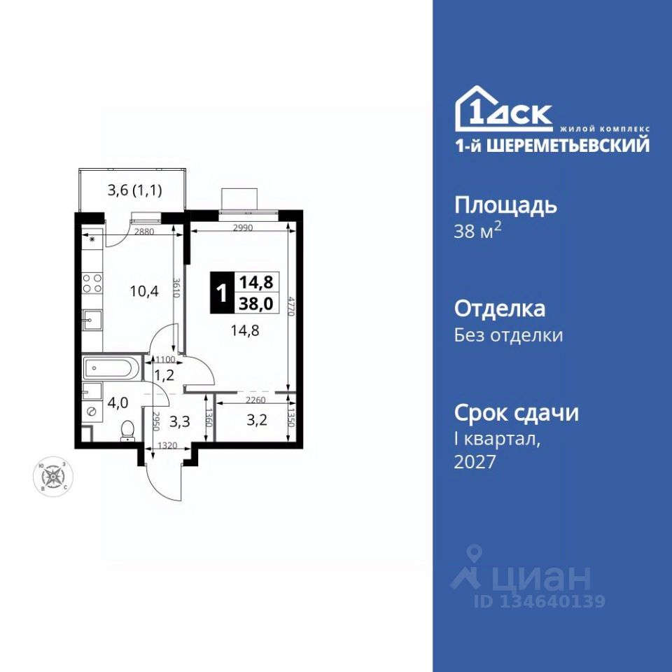 Продаётся 1-к квартира номер 790 общей площадью 38 кв.м. на 7-м этаже 17 этажного здания. Без отделки.