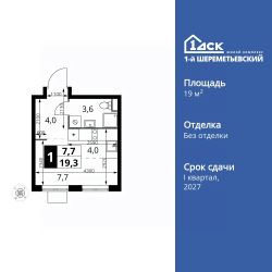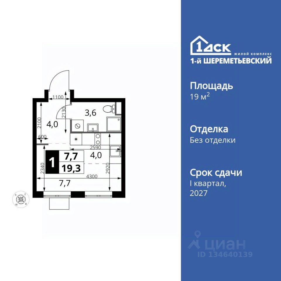 Продаётся квартира-студия номер 1072 общей площадью 19.3 кв.м. на 10-м этаже 17 этажного здания. Без отделки.