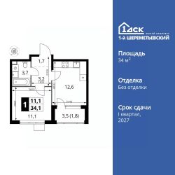 Продаётся 1-к квартира номер 1311 общей площадью 34.1 кв.м. на 13-м этаже 17 этажного здания. Без отделки.