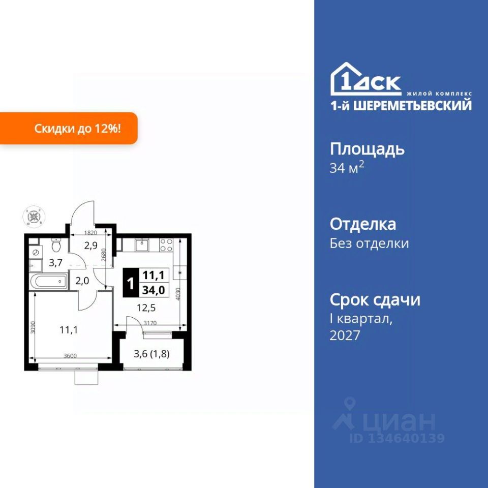 Продаётся 1-к квартира номер 1331 общей площадью 34 кв.м. на 15-м этаже 17 этажного здания. Без отделки.