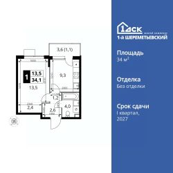 Продаётся 1-к квартира номер 1230 общей площадью 34.1 кв.м. на 6-м этаже 17 этажного здания. Без отделки.