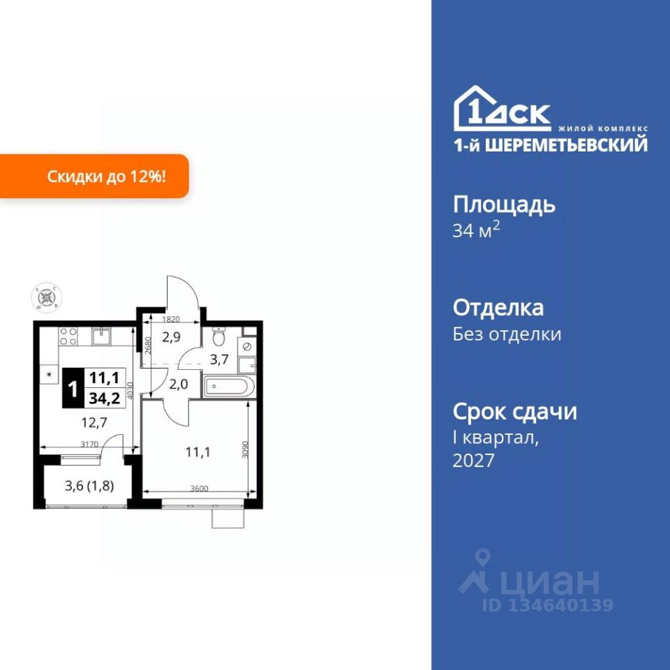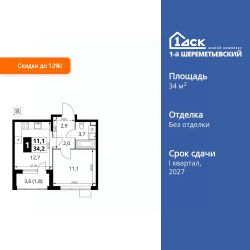 Продаётся 1-к квартира номер 1284 общей площадью 34.2 кв.м. на 11-м этаже 17 этажного здания. Без отделки.