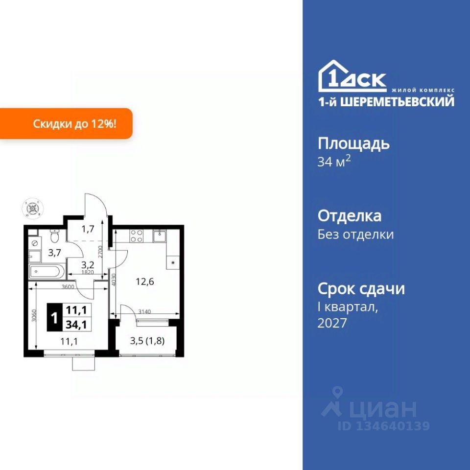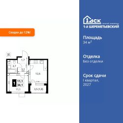 Продаётся 1-к квартира номер 1299 общей площадью 34.1 кв.м. на 12-м этаже 17 этажного здания. Без отделки.