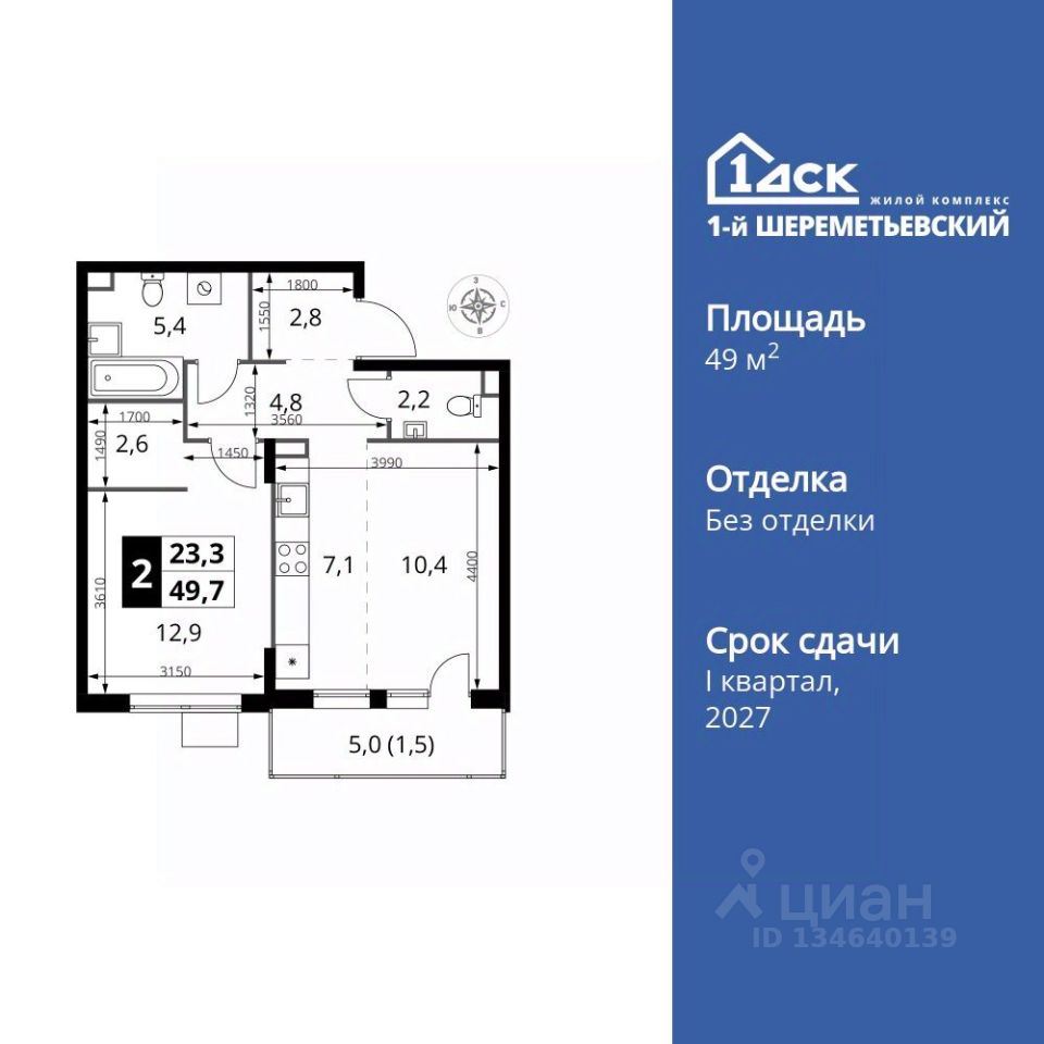 Продаётся 2-к квартира номер 323 общей площадью 49.7 кв.м. на 14-м этаже 17 этажного здания. Без отделки.