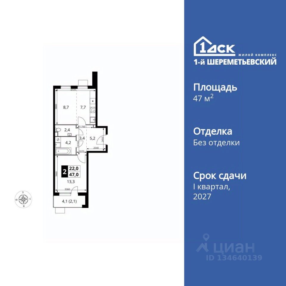 Продаётся 2-к квартира номер 468 общей площадью 47 кв.м. на 16-м этаже 17 этажного здания. Без отделки.