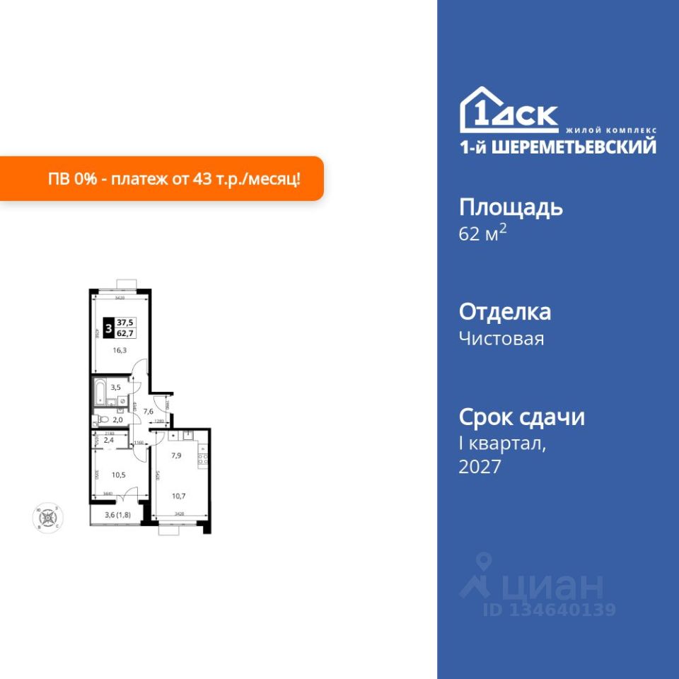Продаётся 3-к квартира номер 711 общей площадью 62.7 кв.м. на 3-м этаже 16 этажного здания. Чистовая отделка. Цена с учётом скидки.