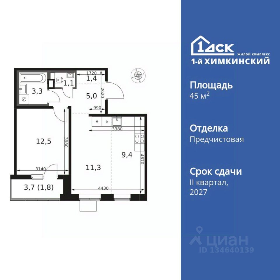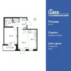 Продаётся 2-к квартира номер 457 общей площадью 45.8 кв.м. на 5-м этаже 14 этажного здания. Отделка Whitebox.