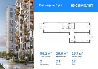 Строим кварталы для жизни с заботой о будущем. Предлагается 2-комнатная квартира комфорт-класса 58,18 кв.м в корпусе 2.1 на 12 этаже, в ЖК "Пятницкие Луга"