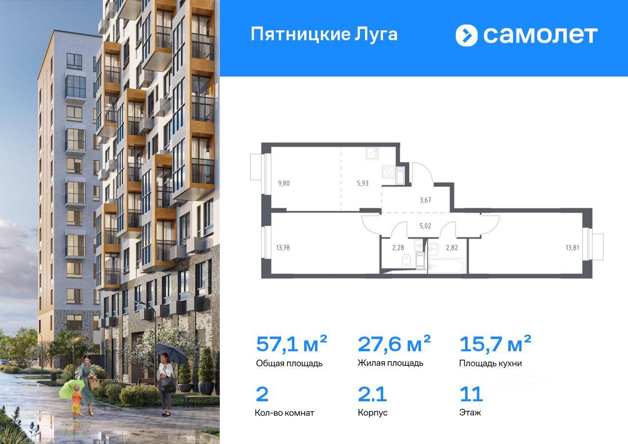 Строим кварталы для жизни с заботой о будущем. Предлагается 2-комнатная квартира комфорт-класса 57,11 кв.м в корпусе 2.1 на 11 этаже, в ЖК "Пятницкие Луга"