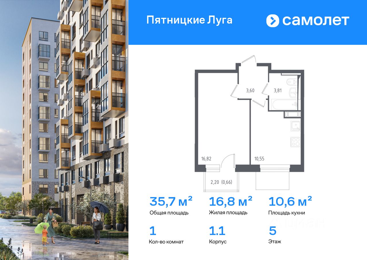 Строим кварталы для жизни с заботой о будущем. Предлагается 1-комнатная квартира комфорт-класса 35,7 кв.м в корпусе 1.1 на 5 этаже, в ЖК "Пятницкие Луга"