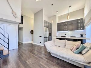 - Два уровня - спальня или релакс зона наверху, а внизу - светлая гостиная с панорамными окнами и видом на благоустроенную территорию.