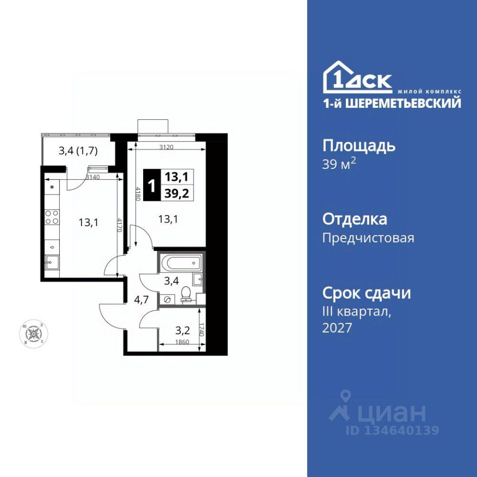 Продаётся 1-к квартира номер 192 общей площадью 39.2 кв.м. на 5-м этаже 16 этажного здания. Отделка Whitebox. Цена с учётом скидки.