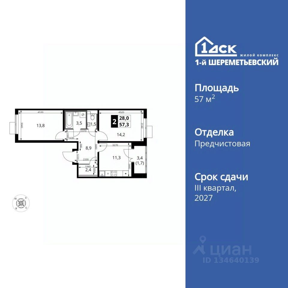 Продаётся 2-к квартира номер 712 общей площадью 57.3 кв.м. на 8-м этаже 13 этажного здания. Отделка Whitebox. Цена с учётом скидки.