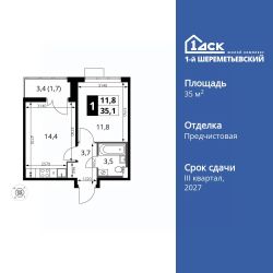 Продаётся 1-к квартира номер 944 общей площадью 35.1 кв.м. на 15-м этаже 16 этажного здания. Отделка Whitebox. Цена с учётом скидки.