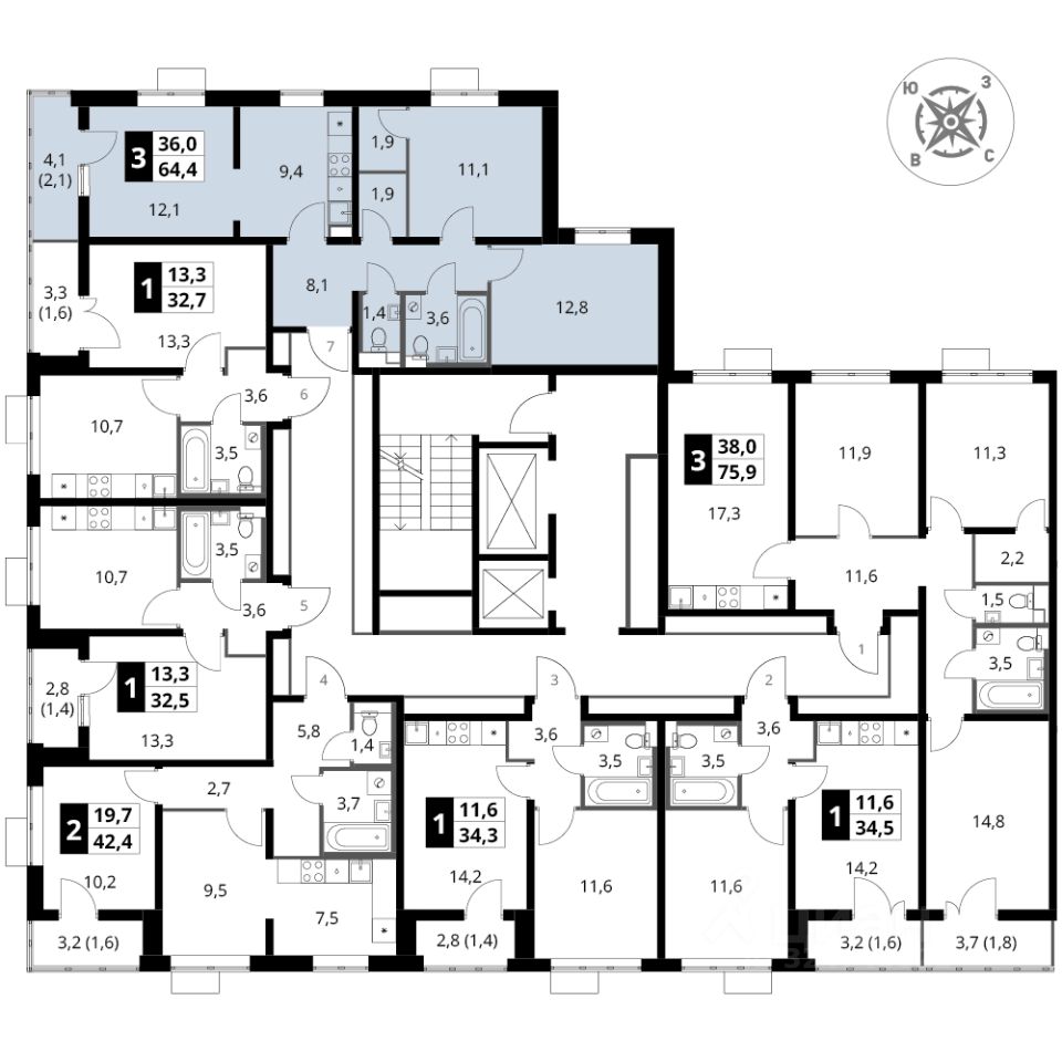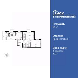 Продаётся 3-к квартира номер 964 общей площадью 64.4 кв.м. на 2-м этаже 16 этажного здания. Отделка Whitebox. Цена с учётом скидки.